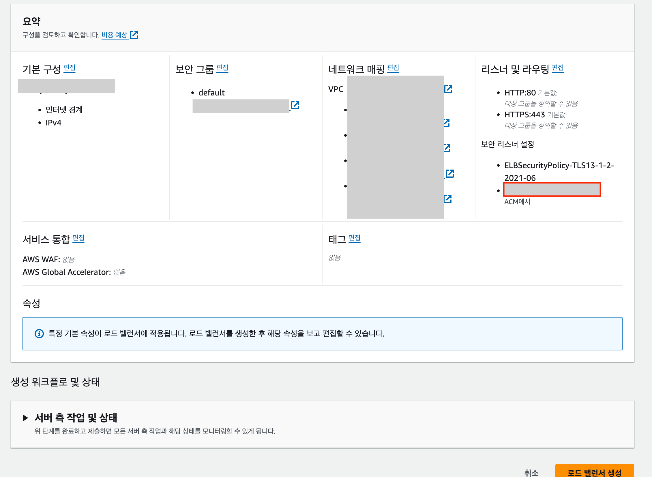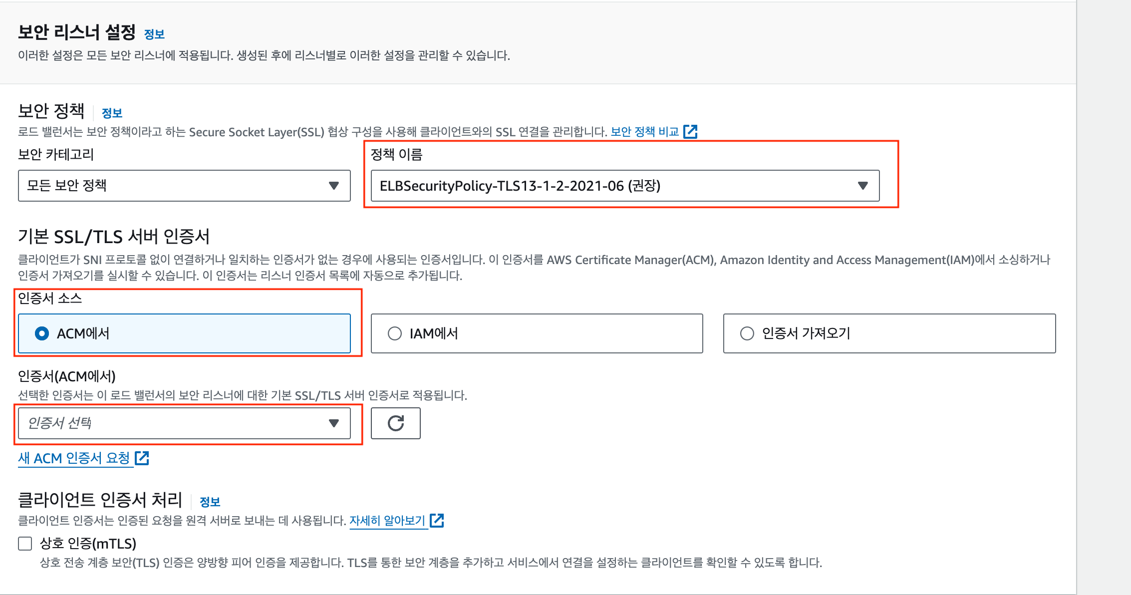 - 기본 SSL/TLS 서버 인증서: ACM에서 생성한 인증서를 사용합니다.