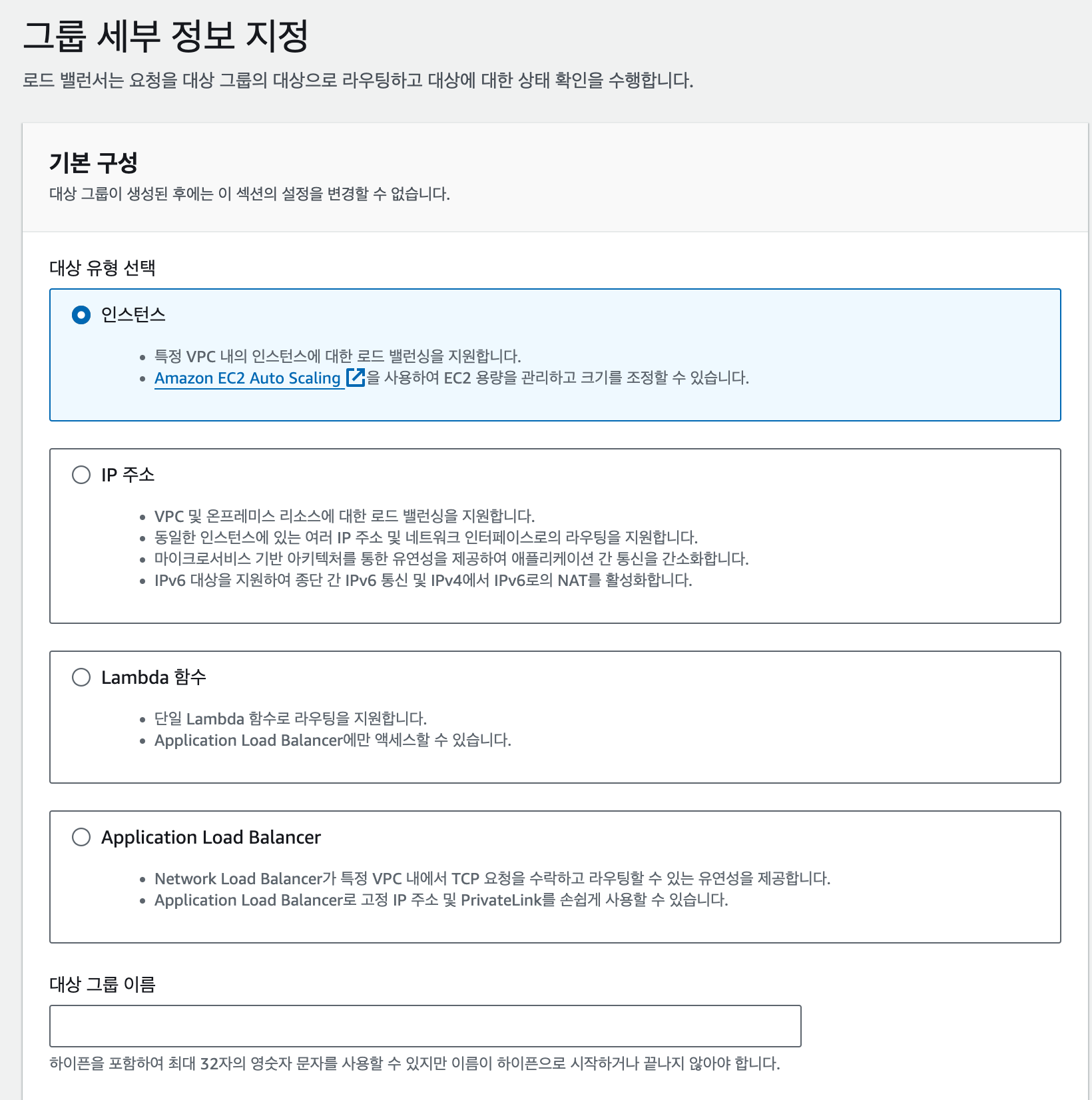 이 포스팅에서는 간단하게 Application Load Balancer를 사용하여 EC2에 직접 연결하려고 하므로 인스턴스를 선택하면 충분합니다.