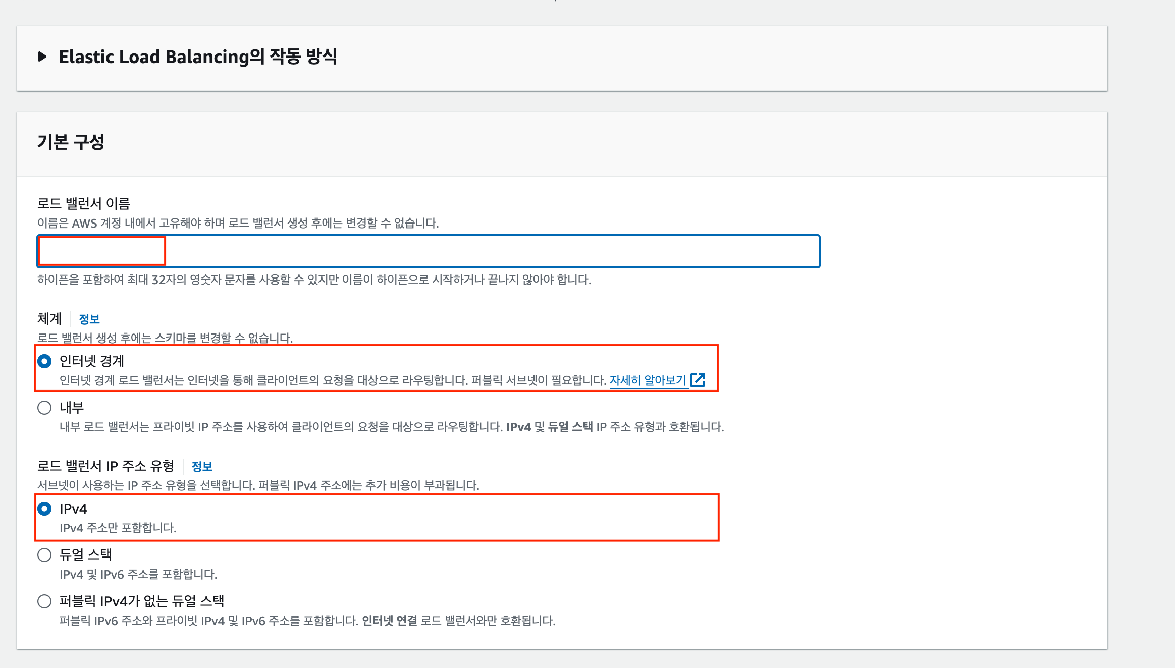 - 체계: 이 포스팅에서는 ELB를 통해 EC2에 연결하려고 하므로 인터넷 경계를 선택합니다.