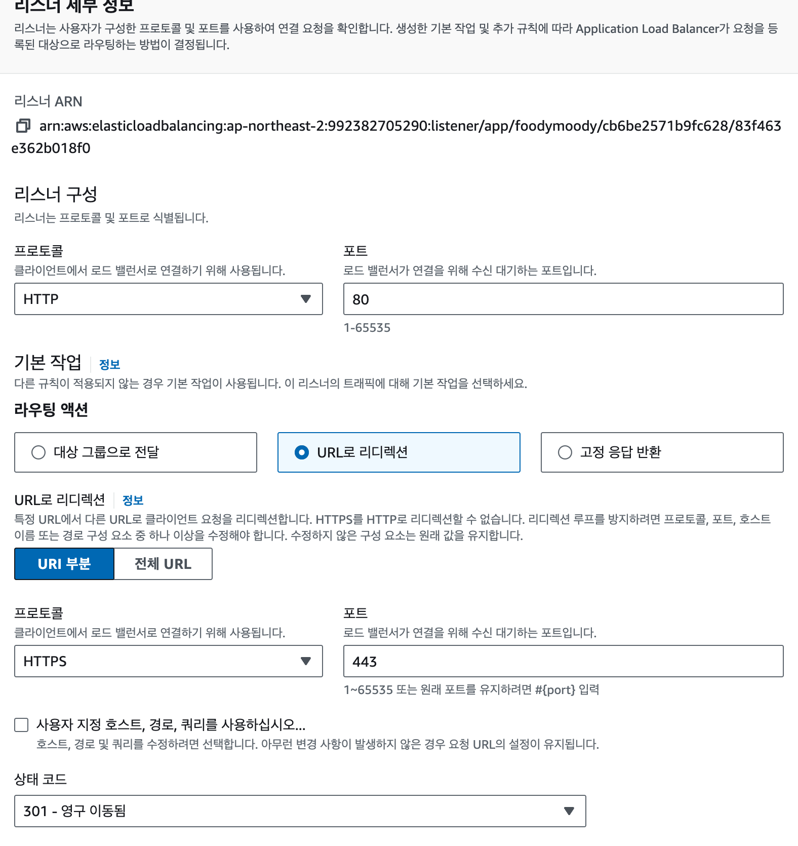 HTTP 포트 리스너는 실제로 대상 그룹에 요청을 전달하지 않고 HTTPS로 리다이렉트하기 위해 설정합니다.