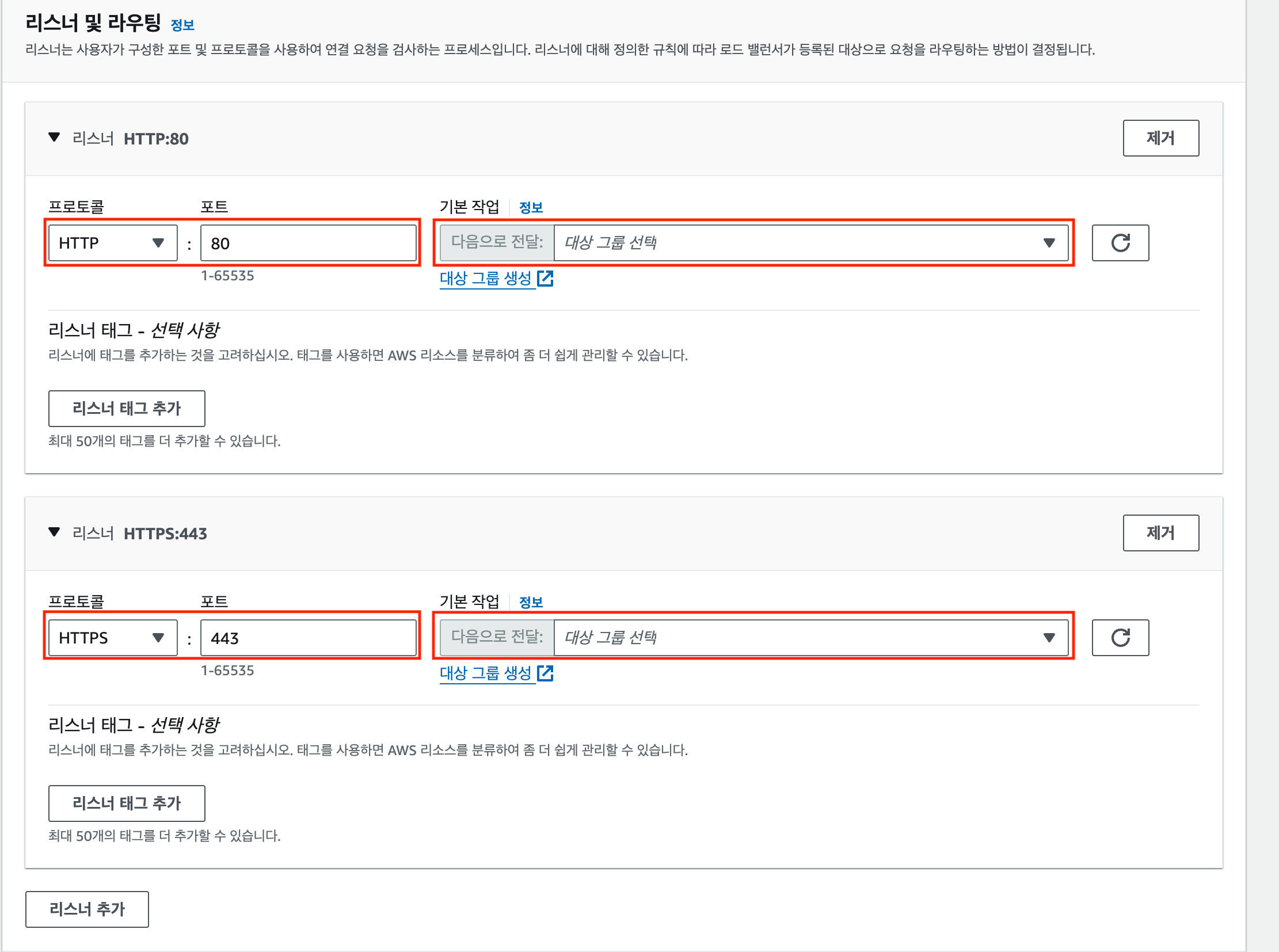리스너 및 라우팅 설정에서 HTTP와 HTTPS 포트를 모두 선택하고 대상 그룹을 지정합니다.