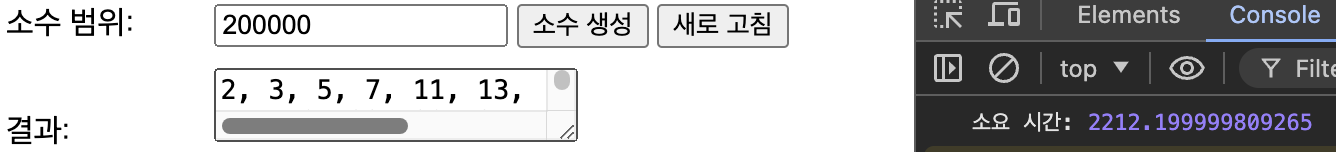 그런데 200,000 범위 내의 소수 생성 버튼을 누르면 소수를 생성하는데 브라우저 개발자 도구로 확인했을 때 약 2초 걸립니다.