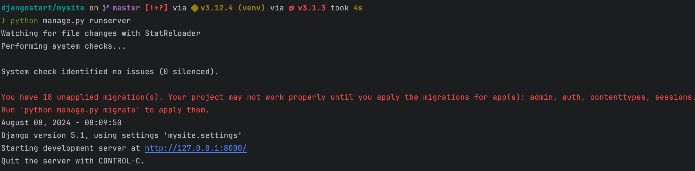 | 첫 번째 Django 앱 만들기 (Part 2: Models and the admin site) (0) | 2024.08.10 |