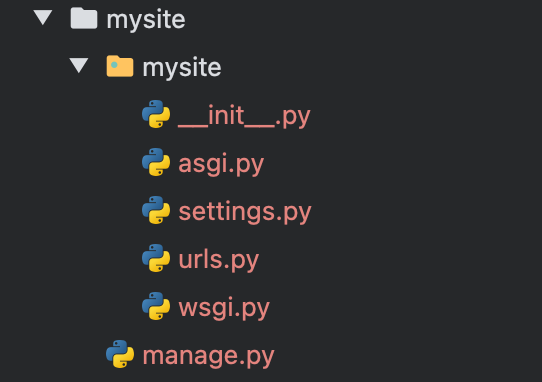 이 명령어은 현재 디렉토리에서 mysite 라는 디렉토리를 생성합니다. 이 디렉토리 안에는 기본 Django 프로젝트 구조와 필요한 설정 파일들이 자동으로 생성됩니다.