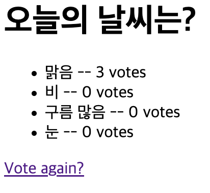 이제 브라우저에서 /polls/3로 이동하여 질문에 투표할 때마다 업데이트되는 결과 페이지가 표시됩니다.