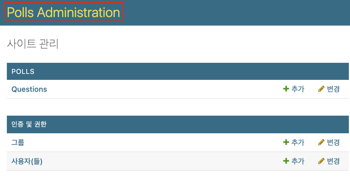 그런 다음 {{ site_header|default:_('Django administration') }}를 Polls Administration으로 변경합니다.