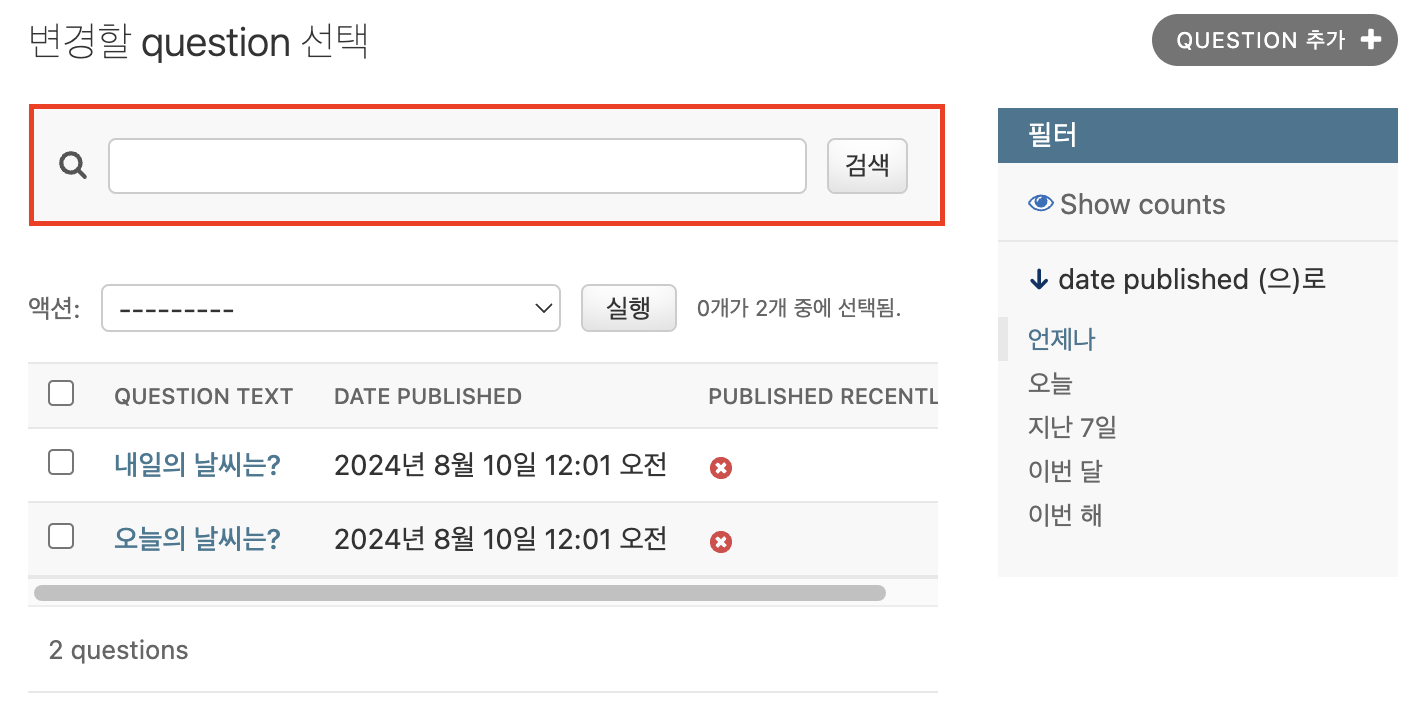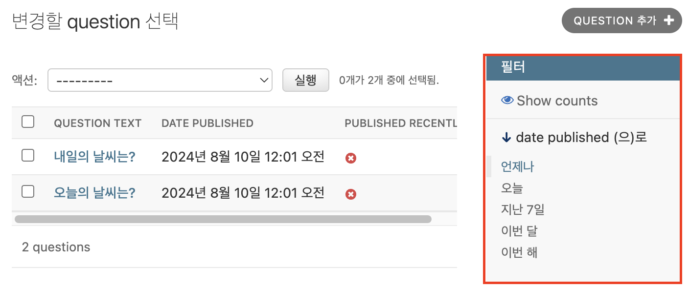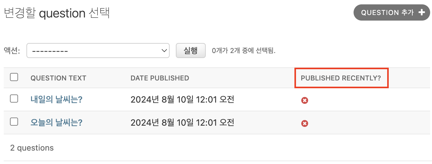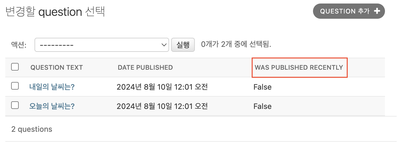 일반적으로 각 열의 헤더를 클릭하면 해당 값을 기준으로 정렬할 수 있습니다. 그러나 was_published_recently 헤더와 같이 임의 메서드의 출력값으로는 정렬이 지원되지 않습니다. 기본적으로 메서드 이름(밑줄은 공백으로 대체됨)이 헤더 이름이 됩니다.