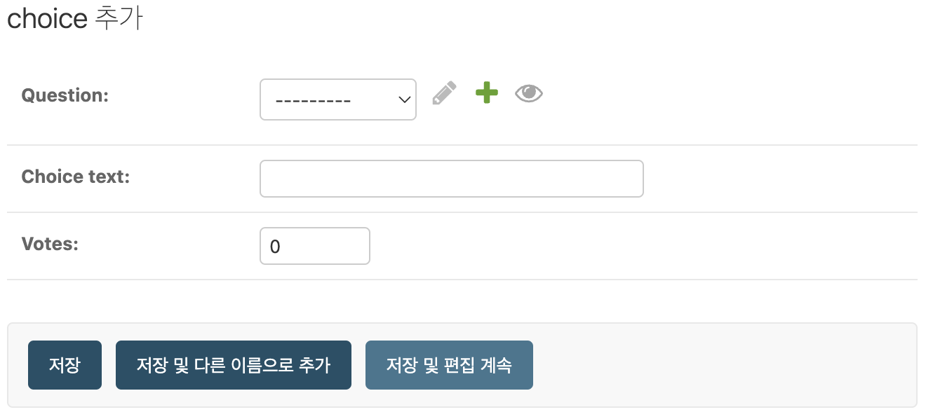 이렇게 하면 Django는 Choice 객체가 Question 관리자 페이지에서 편집되고 기본적으로 3개의 선택 항목을 제공해야 한다고 알리게 됩니다.