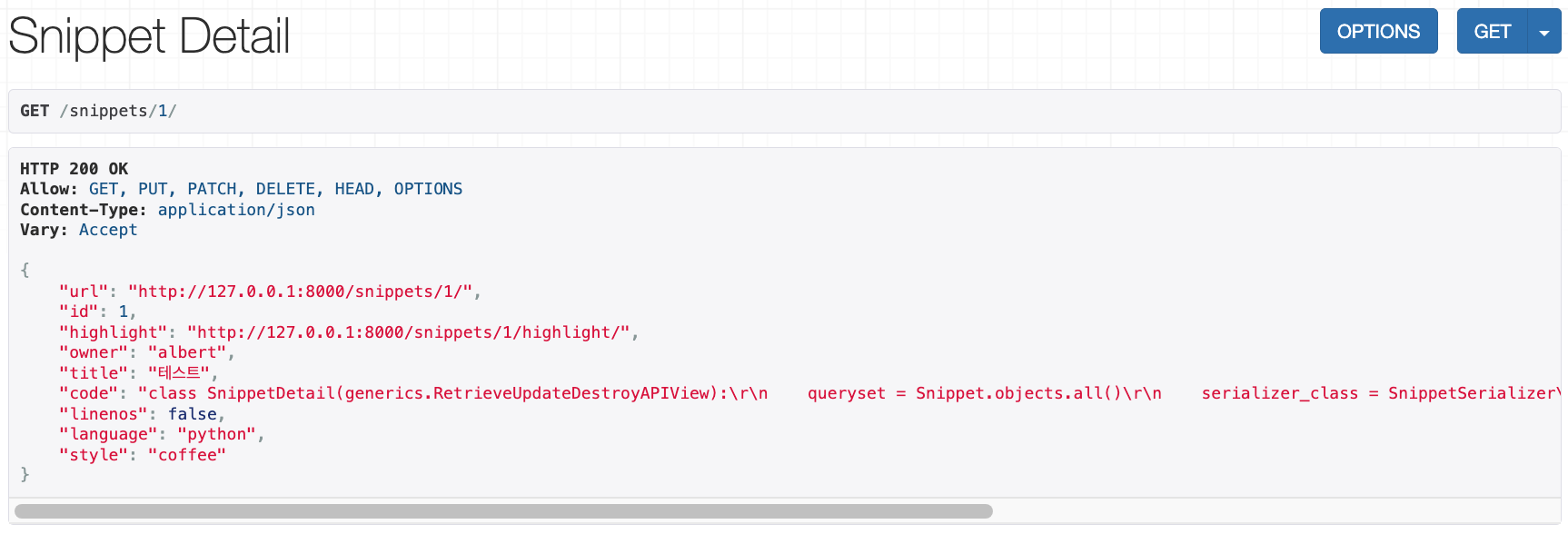 이렇게 하면 UserSerializer와 SnippetSerializer에서 각각 url 필드가 자동으로 추가되어 하이퍼링크 형태로 데이터를 표현할 수 있습니다.