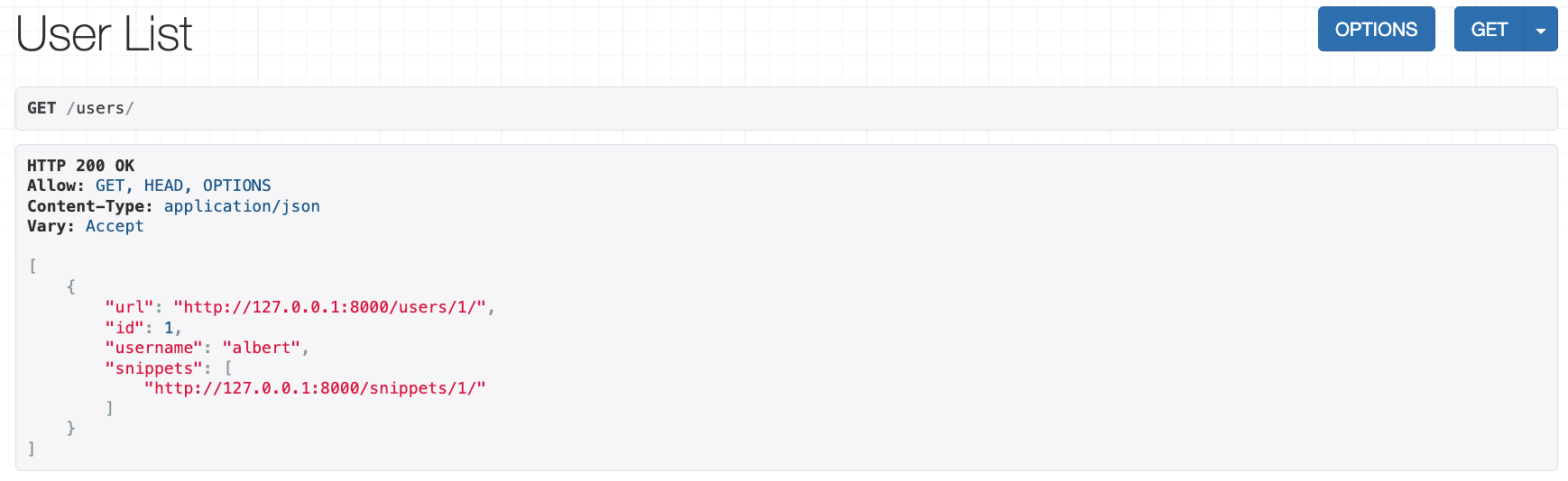 - HyperlinkedIdentityField를 사용하는 URL 필드가 포함됩니다.