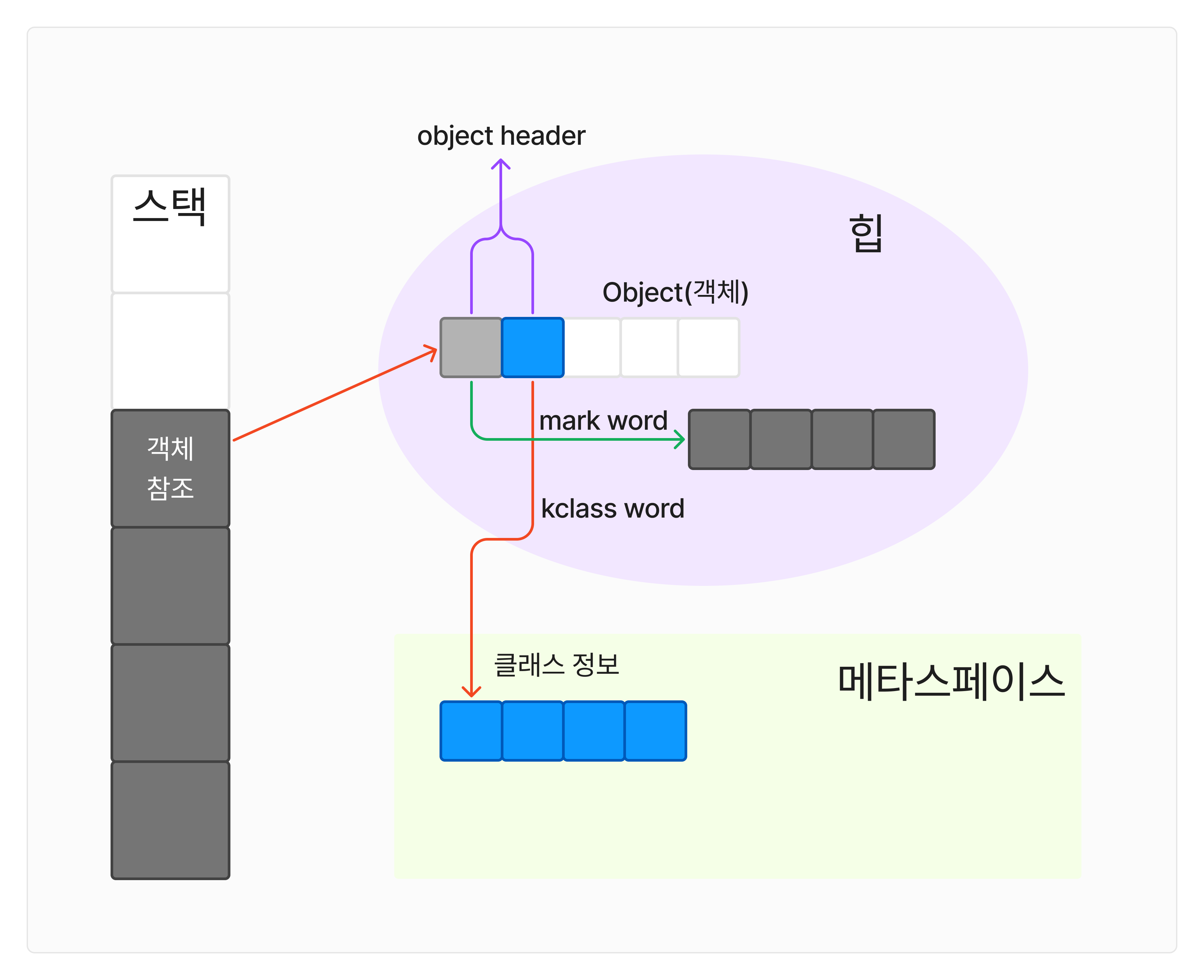 모든 자바 객체는 객체 헤더(object header)를 가지고 있습니다. 객체 헤더는 고유한 메타데이터(mark word), 공유하는 메타데이터(klass word)를 가지고 있습니다.