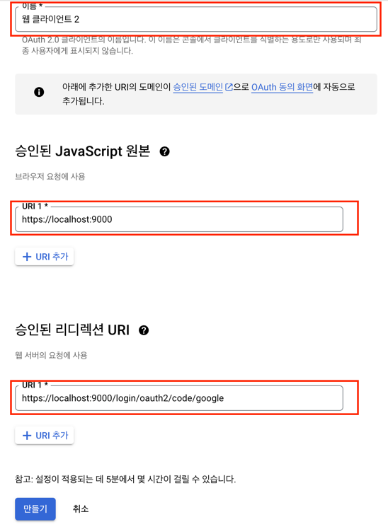 사용자 인증 정보>사용자 인증 정보 만들기를 클릭합니다.OAuth 클라이언트 ID를 선택합니다.웹 애플리케이션을 선택하고이름을 입력합니다.승인된 JavaScript 원본과승인된 리디렉션 URI를 입력합니다.승인된 JavaScript 원본: 브라우저에서 JavaScript를 사용하여 Google API를 호출할 때 사용하는 도메인입니다.- 예: