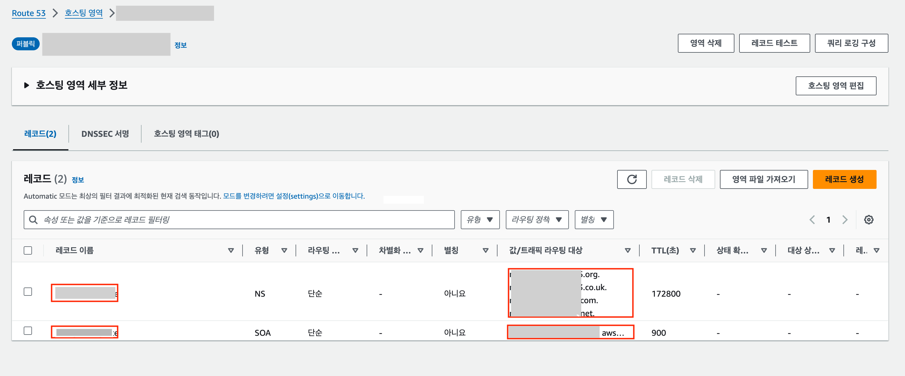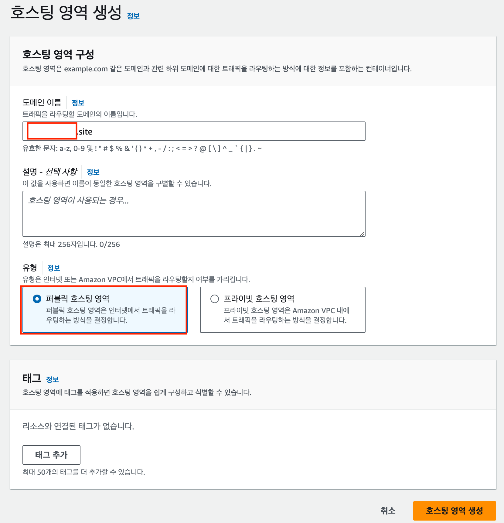도메인 이름을 입력하고 퍼블릭 호스팅 영역을 선택합니다.(참고 자료)