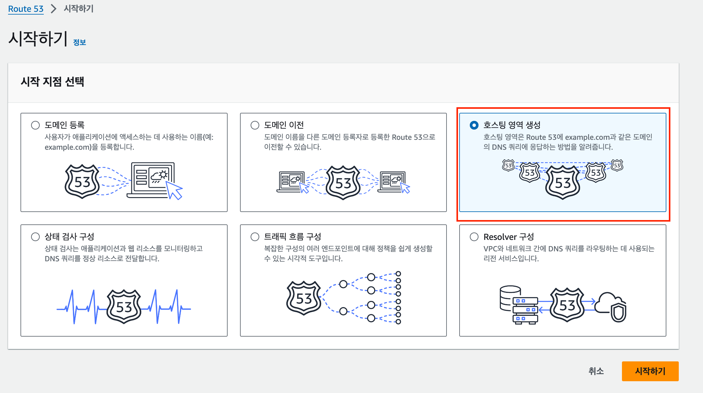 DNS 쿼리에 응답하는 방법을 구성하기 위해 호스팅 영역 생성을 선택합니다.
