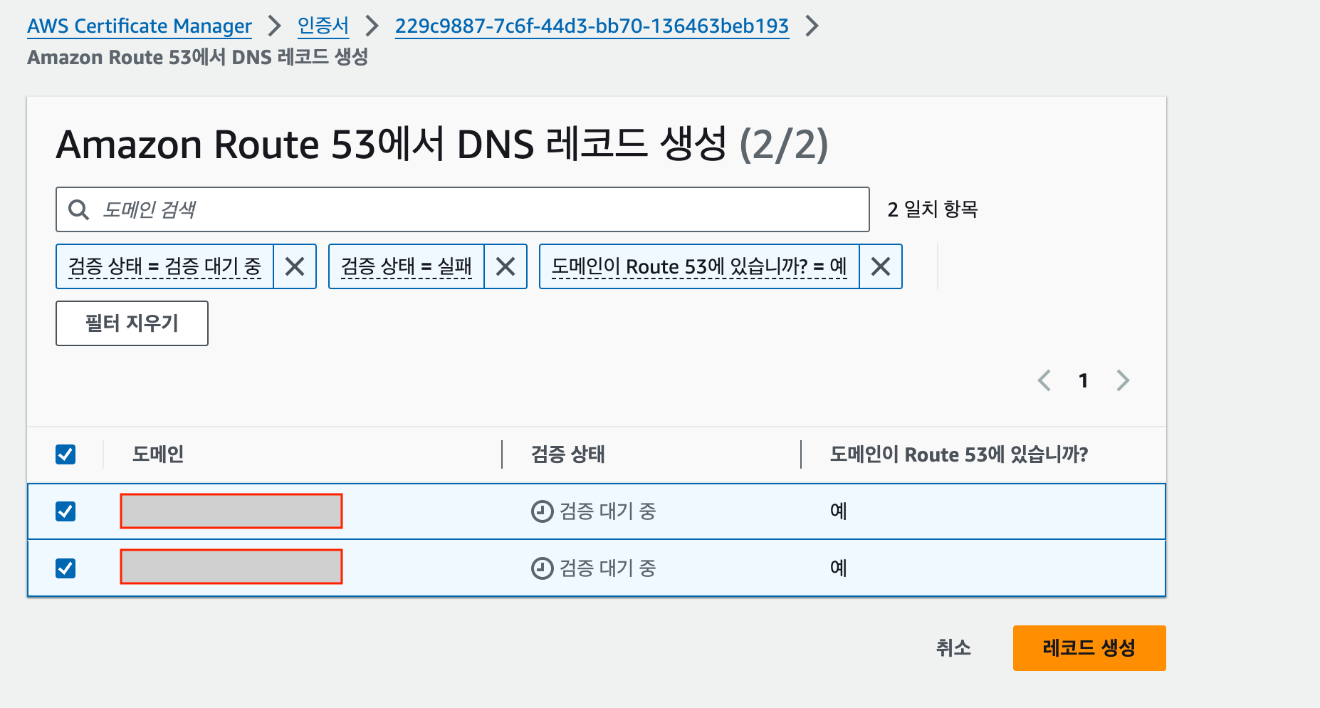 5. 인증서에 해당하는 도메인을 선택하고 레코드 생성을 클릭합니다.