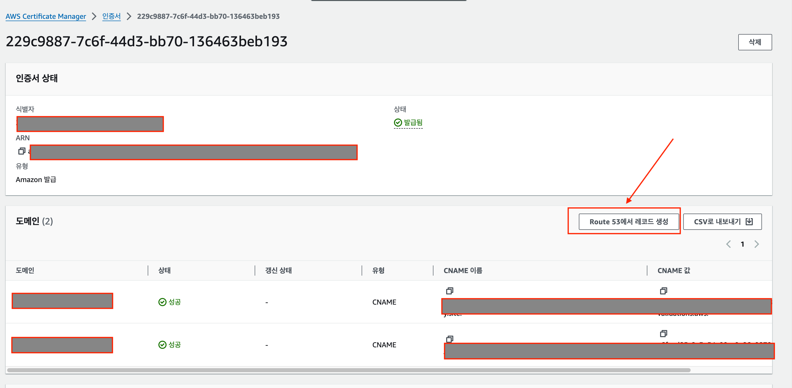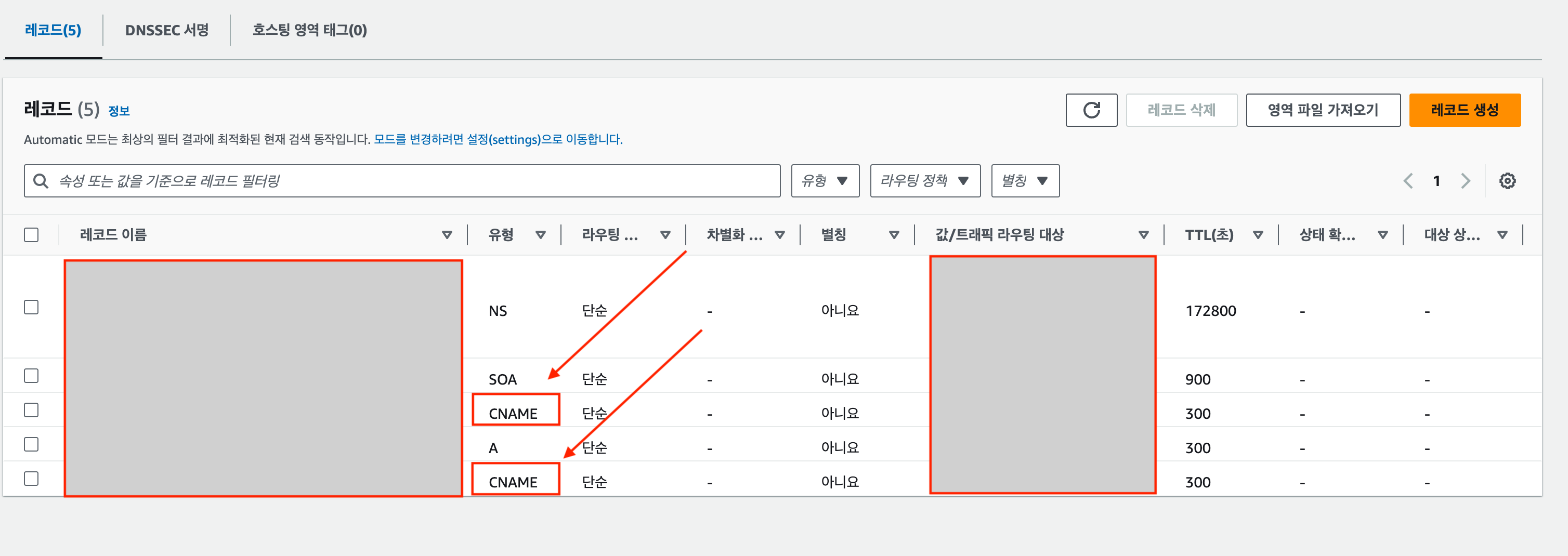 6.Route 53에 CNAME 유형의 레코드 2개가 생성됩니다.